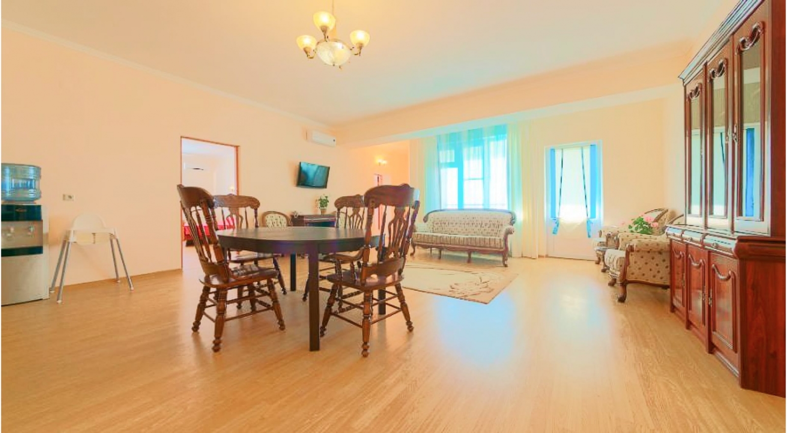 Мебель: большая двуспальная кровать, большой раскладной диван, кресло-кровать, обеденный стол, прикроватные тумбочки, шкаф для одежды.