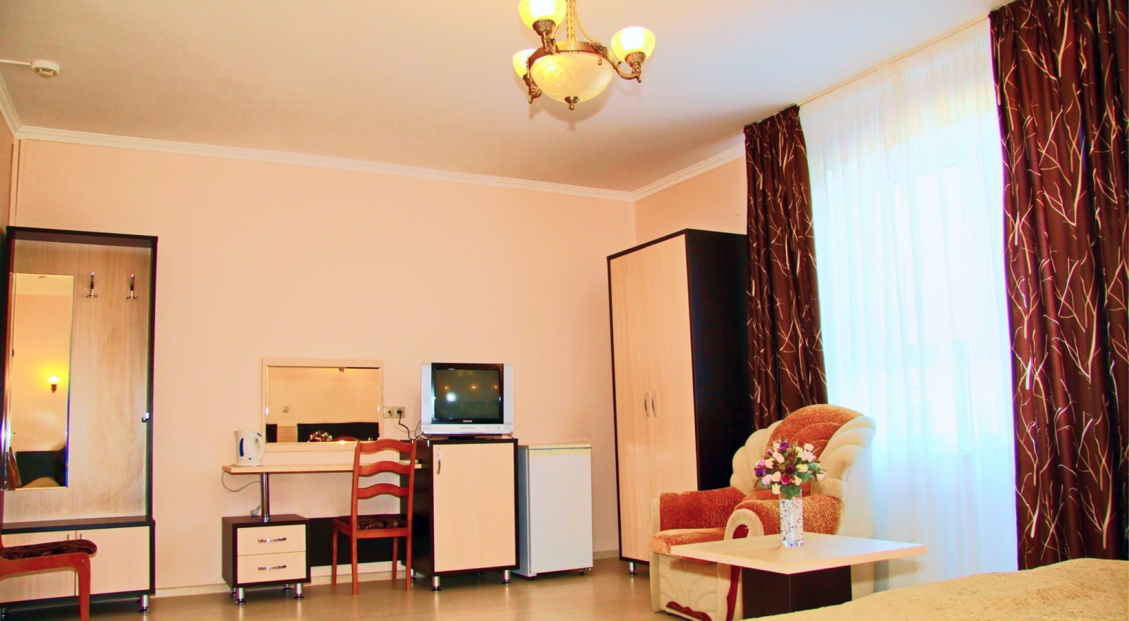 Однокомнатный улучшенный трёхместный номер в 5-ом корпусе с тремя основными местами. Площадь номера 35-40 м2. При необходимости в номер в качестве основного места предоставляется дополнительная односпальная кровать.